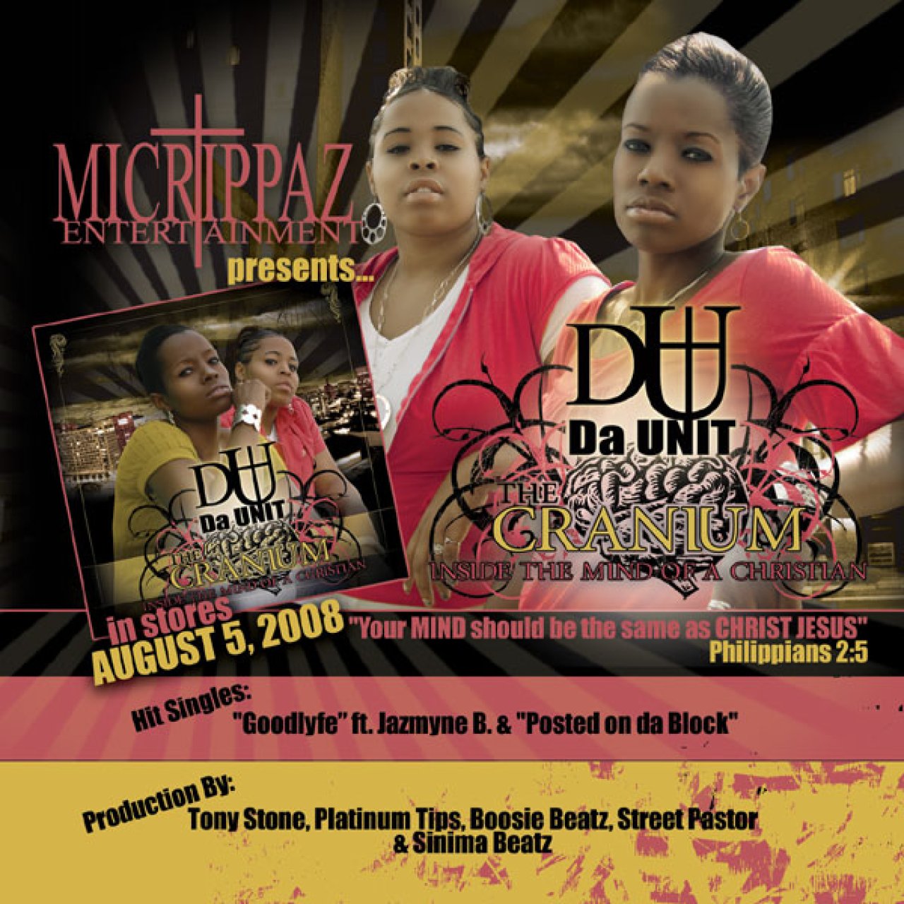 La La and Lay’ Qa met and soon, became roommates and put their focus on the ministry of our youth. There goal is to “Educate and Save Souls through the Gospel of Jesus Christ” Both young ladies have huge and exciting testimonies which you will hear on their debut album “THE CRANIUM” featuring artist such as BB Jay, Jasmine Butler, k-drama, D MAUB, and many others. Production in by Tony Stone, Platinum Tips, Boosie Beatz, and many others…