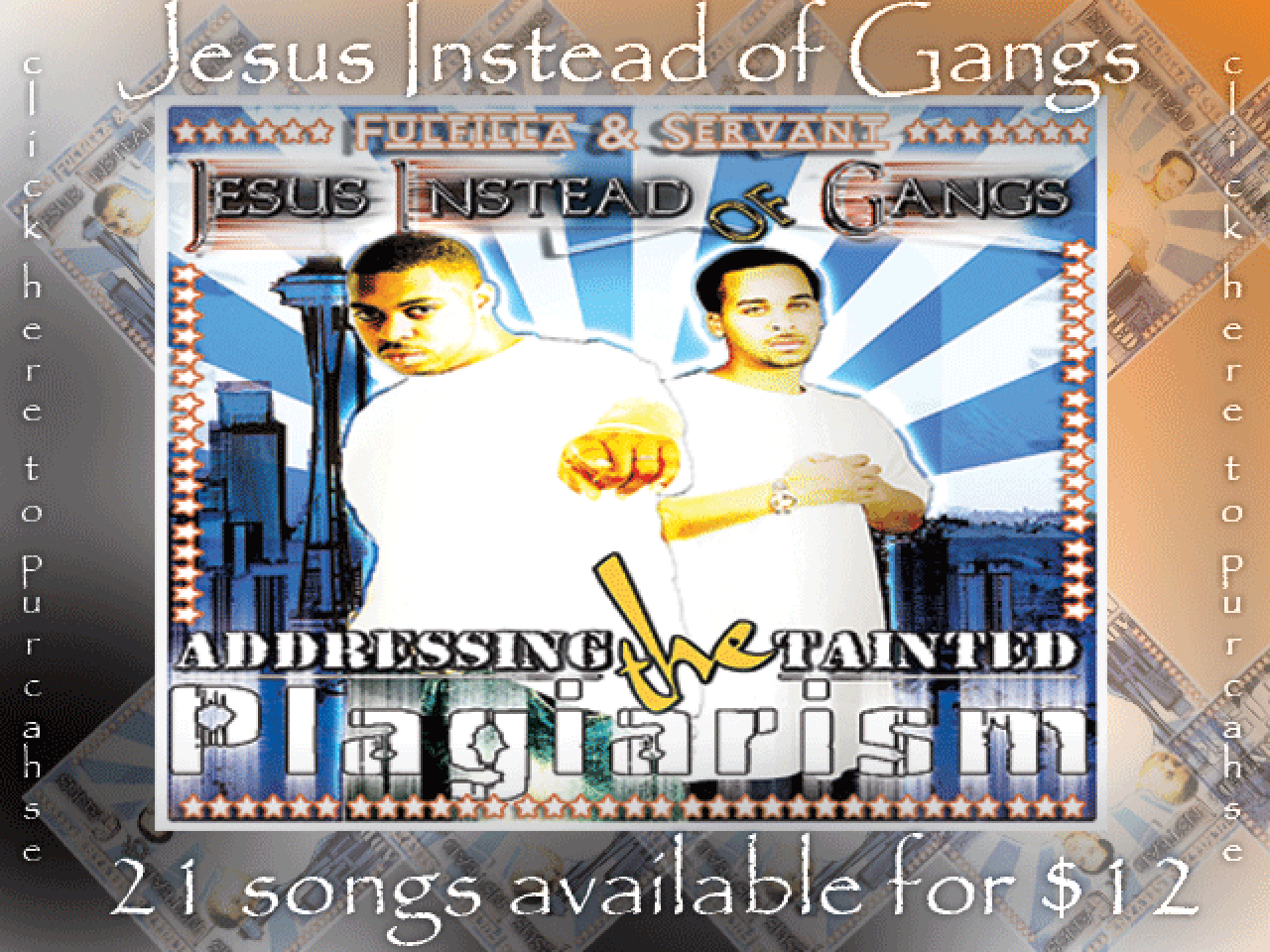 Bio: Jesus Instead of Gangs(JIG), formed by Marquis Franklin(Tha Servant) and Marcel Wilson(Fulfilla) have been ministering through hip hop for last 8 years. Their focus is to spread the gospel through a language that the youth of today can understand. Both Tha Servant and Fulfilla were saved at a young age, and while at school they were made ridiculed for the stand they took for Christ. J.I.G. has ministered at various locations including churches, parks, boys and girls clubs, schools and christian clubs. Their main target audience is those who are of the church. "Many times the church is so focused on outreach yet we still have those who are in the church we need to be ministering to. Not only do they need to be ministered to they also need music that will keep them from the secular music, that is so strong in today's society"-Tha Servant J.I.G. knows that they are also called to minister to those who haven't yet received Christ as Lord. Their main focus is to win the lost, whether inside or out the church, and allow them to have a personal relationship with Jesus. J.I.G. has currently dropped two albums. The debut album released February 2003 was entitled "Preachin' Tha Word" and their sophomore album released November 2006 was entitled "Addressing The Tainted Plagiarism." "We are looking forward to sharing the message of Jesus Christ to the masses, and allowing God to shape our music and our lives." Pray for Jesus Instead of Gangs as they acccept the call of God in their lives and pray that the people they will reach take heed to the Gospel. -Life