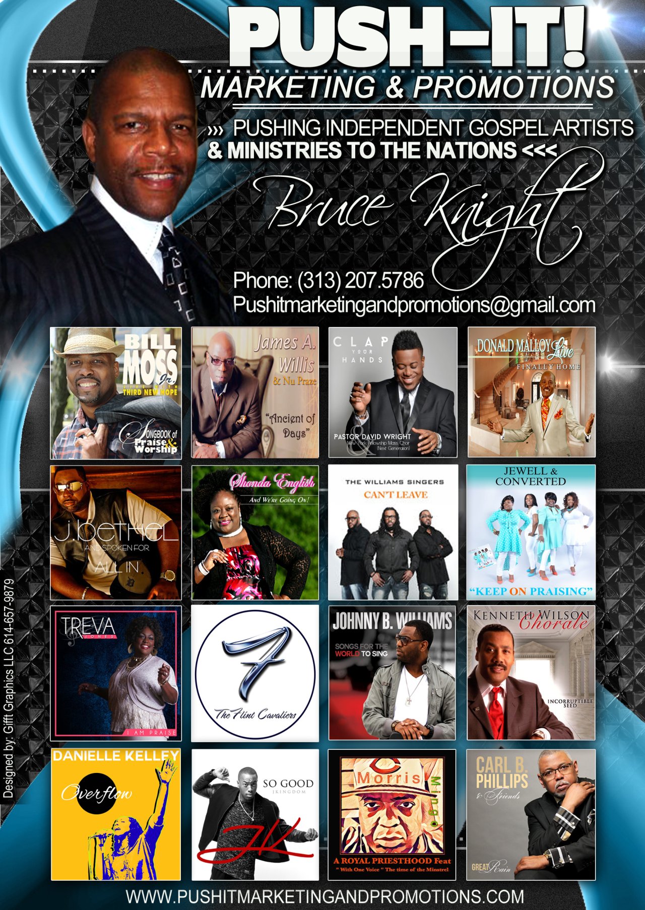 He returned to Detroit and was appointed National Director of Promotion and Marketing for Crystal Rose Records a Detroit based gospel label founded by Detroit Attorney Benjamin Whitfield, Producers Michael Powell, Donald Lawrence and Brian Spears. They have recorded such artists as Donald Lawrence & The Tri-City Singers, Ricky Dillard and New Generation, The Thomas Whitfield Company, Chris & Kyle, Gabriel Hardeman, Rodney Posey, Twinkie Clark & The Florida A & M Gospel Choir and Brenda Waters. Bruces’ expertise and network abilities have enabled him to work with the most influential people in the entertainment industry today. His collaboration with other record industry moguls has opened the doors for many up and coming recording artist in areas of promotion and sales in various markets. He identified the need for Independent Gospel Artists to market themselves though his internet marketing and promotions firm, formerly known as Push-It Marketing & Promotions!