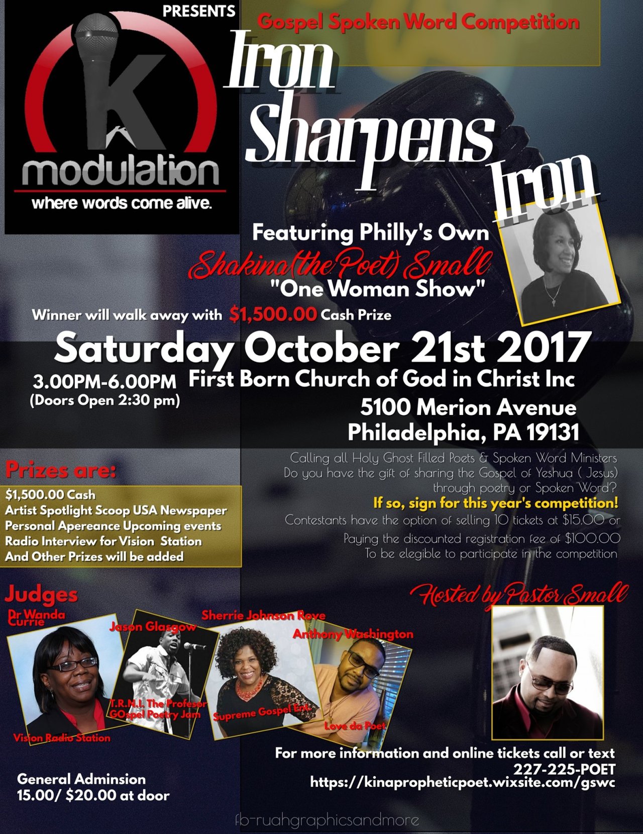 Today, Shakina is busy training, teaching and raising up other poets/spoken word artists to identify and understand prophetic poetry. Shakina is also the Founder of K-Modulation, LLC "where words come alive" where she is one of the first who is pioneering a major platform for Christian Spoken Word Artists in the Philadelphia area through promoting spoken word competition and talent showcases.
